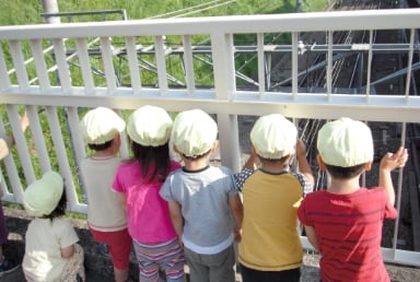 園舎の横を流れる早渕川にはカモなどがいて、自然環境に恵まれ、遊歩道は子ども達の散歩コースになっています。